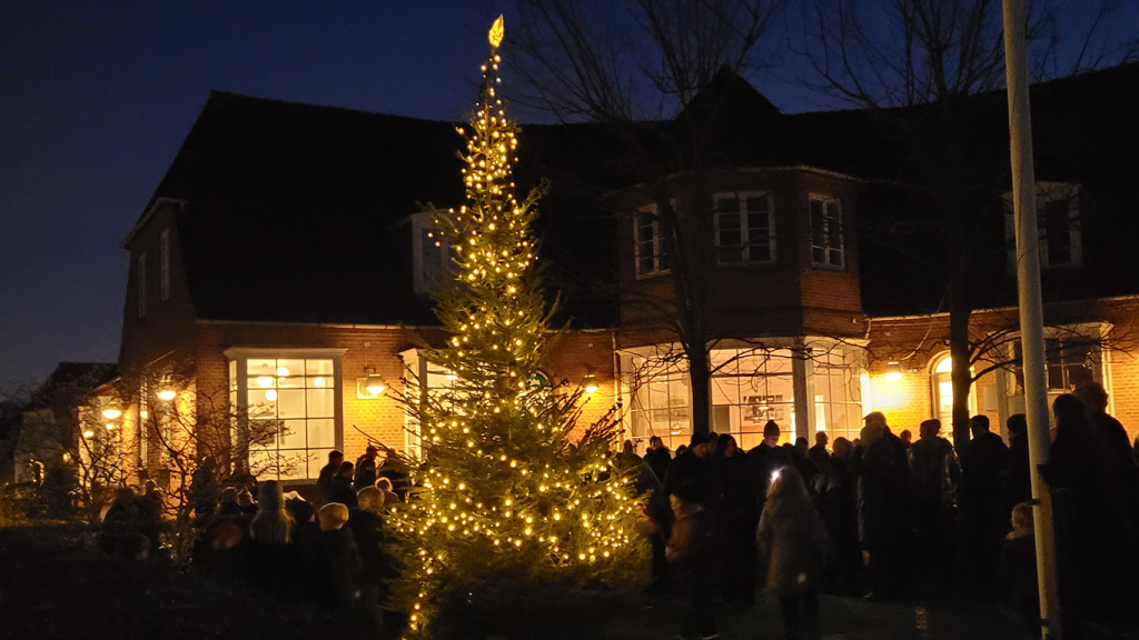 Vi tænder træet, når alle er kommet på plads – og håber selvfølgelig på en stille, klar decemberdag.